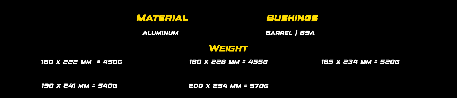 | Width | 180 x 222 mm, 180 x 228 mm, 185 x 234 mm, 190 x 241 mm, 200 x 254 mm |