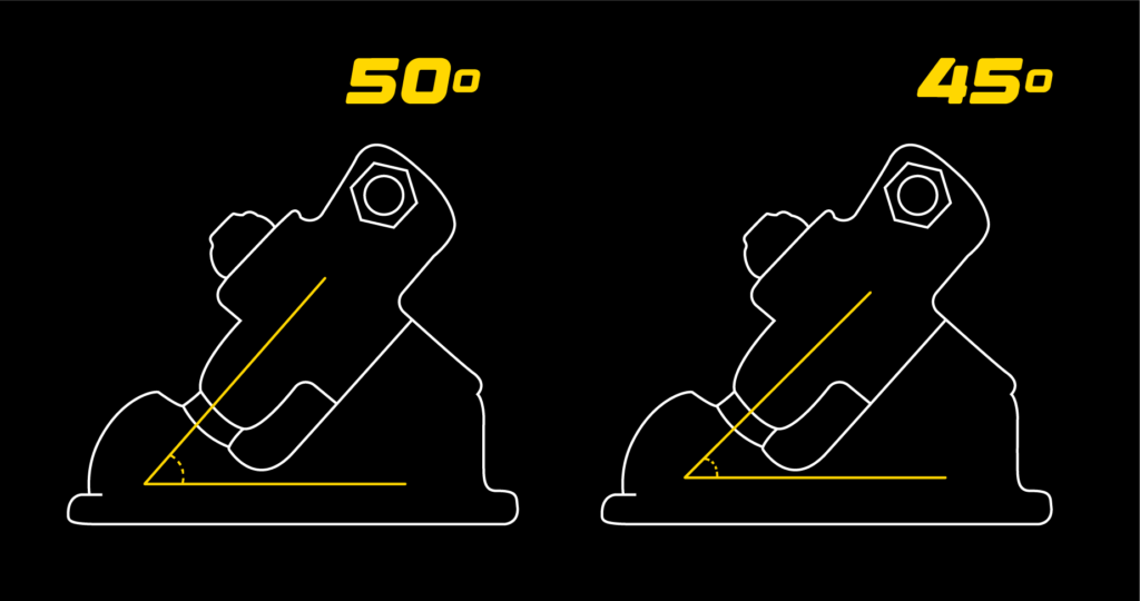 - 45° ou menos → Mais estável em velocidades mais altas, favorece slides mais agressivos.