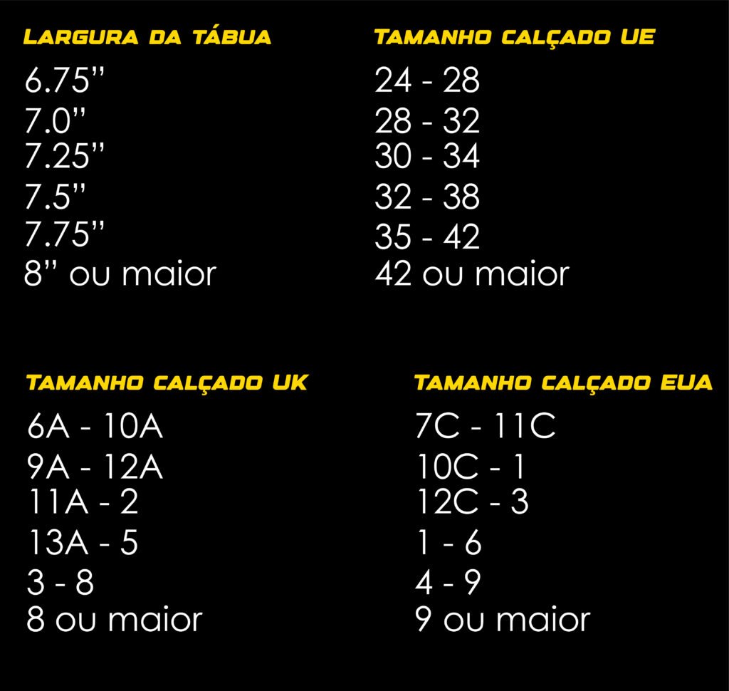 Ao escolher um tamanho de street skate ou uma tábua para o mesmo, considera sempre o tamanho do teu calçado. Podes ter como referência o desenho e a tabela seguintes :